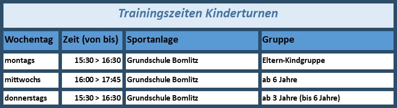Kinderturnen ist der Einstieg in die Sportwelt. Im Kinderturnen werden die Kinder altersgerecht und ihren motorischen Fähigkeiten entsprechend gefordert und gefördert. Im gemeinsamen Spielen und Bewegen mit Gleichaltrigen lernen sie das Einfügen in eine Gruppe, Regeln und den fairen Umgang im Sport.